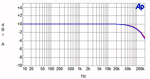 Chart 1 shows the frequency response of the amp with varying loads. As can be seen, the output impedance, as judged by the closeness of spacing between the curves of open-circuit, 8-ohm, and 4-ohm loading, is quite low over the audio range, and only above perhaps 50kHz can one see any sign of a change with loading. The NHT dummy speaker load is not plotted here as the variations with frequency would not be observable with this vertical scale factor. Needless to say, difficult, impedance-varying speaker loads are not going to affect the flat-delivered response from this amplifier.