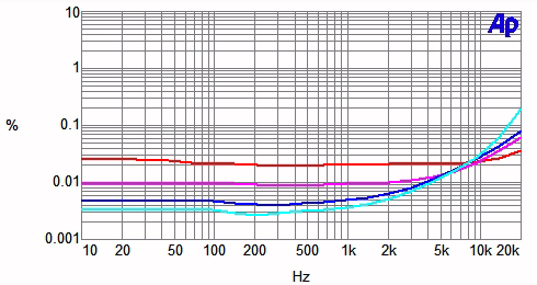 Total harmonic distortion plus noise as a function of frequency at several different power levels is plotted in Chart 3. There is a moderate rise in distortion with frequency at the higher power levels.