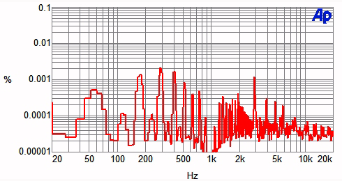 A spectrum of the harmonic distortion and noise residue of a 10W 1kHz test signal for 4-ohm loading is plotted in Chart 5. Even though the measured output noise of this amp was low, the nature of the noise is mostly pulses when the power-supply rectifiers conduct and, consequently, there are a lot of higher harmonics of the AC-line frequency in this spectrum. The 1kHz signal distortion consists of a quickly declining series of even and odd harmonics.