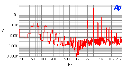 a 10W 1kHz test signal is plotted in Chart 5. The magnitude of the AC-line harmonics are