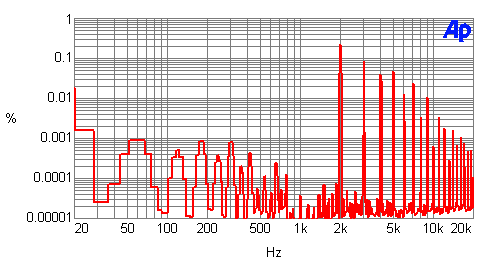 A spectrum of the harmonic distortion and noise residue of a 10W 1kHz test signal is plotted in Chart 5. The magnitude of the AC-line harmonics is quite numerous and intermodulation components of line harmonics with signal harmonics are also just visible near the noise floor. The test signal harmonics are both even and odd and don't decline or tail-off with frequency very fast.