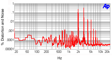 range. In the spectral plot of distortion and noise for a 10W 1kHz signal into an 8-ohm