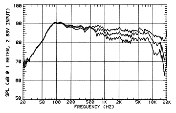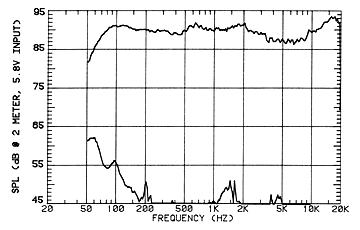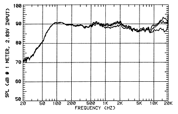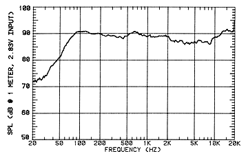 Microphone measuring position: tweeter axis (manufacturer specified) Sensitivity: 89.5dB (averaged 300Hz-3kHz, 2.83V/1m) Frequency response, 20Hz - 20kHz