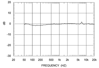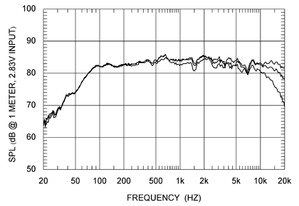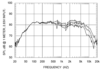 Microphone measuring position: midpoint between mid-woofer and tweeter Grille: off Sensitivity: 84.0dB (averaged 300Hz-3kHz, 2.83V/1m) Frequency response, 20Hz - 20kHz