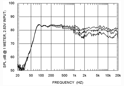 Microphone measuring position: midpoint between mid-woofer and tweeter Grille: off Sensitivity: 84.5dB (averaged 300Hz-3kHz, 2.83V/1m) Frequency response, 20Hz - 20kHz